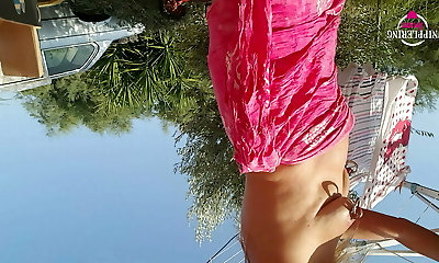 nippleringlover - horny milf without bra outdoors flashing pierced tits & pierced muff, extremely stretched nipple piercing