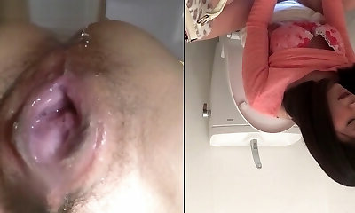 Slender brunette stretches anal with a long fucktoy, deep penetration, belly play through anal, jet climax.